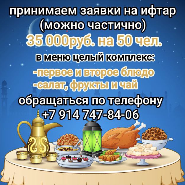 Сумма для проведения полноценных ифтаров в кафе при мечети - 35 000 рублей/день(на 50 постящихся).