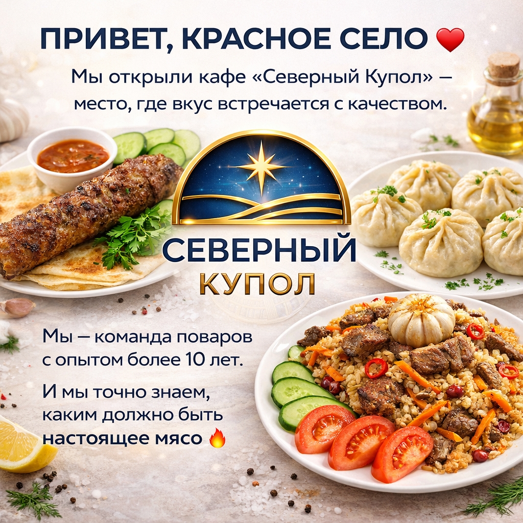 Кафе «Северный Купол» — это команда профессиональных поваров с опытом более 10 лет в городе Санкт-Петербург (Красное Село). Готовят вкусные и сытные халяль-блюда из говядины, курицы, баранины и свежих овощей. В просторном светлом зале на 120 мест комфортно всей семье — без алкоголя и с доступными ценами.